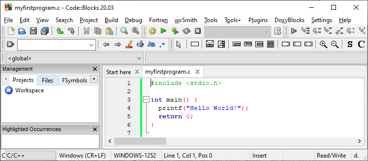 编写以下 C 代码,并将文件保存为 myfirstprogram.c(文件 > 文件另存为):