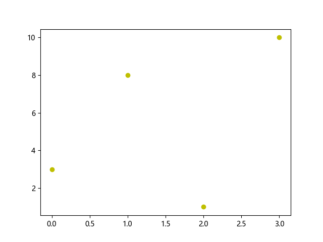 # 这三行代码让编译器支持绘图功能: import sys import matplotlib matplotlib.use('Agg') import matplotlib.pyplot as plt import numpy as np ypoints = np.array([3, 8, 1, 10]) # 绘制带黄色(y)圆形(o)标记的折线图 plt.plot(ypoints, 'oy') plt.show() # 这两行代码实现图形输出: plt.savefig(sys.stdout.buffer) sys.stdout.flush()