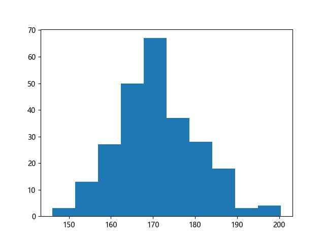 # 以下三行代码使编译器支持绘图功能: import sys import matplotlib matplotlib.use('Agg') import matplotlib.pyplot as plt import numpy as np # 生成正态分布数据: x = np.random.normal(170, 10, 250) # 均值 170,标准差 10,250 个数据点 # 绘制直方图: plt.hist(x) # 创建直方图 plt.show() # 显示图表 # 以下两行代码使编译器能够输出图形: plt.savefig(sys.stdout.buffer) sys.stdout.flush()