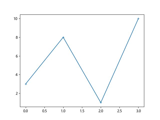 # 这三行代码使编译器能够绘图: import sys import matplotlib matplotlib.use('Agg') import matplotlib.pyplot as plt import numpy as np ypoints = np.array([3, 8, 1, 10]) # 使用加号标记绘制 plt.plot(ypoints, marker = '+') plt.show() # 这两行代码使编译器能够输出图形: plt.savefig(sys.stdout.buffer) sys.stdout.flush()