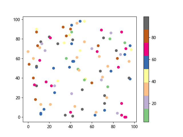 # 这三行代码使编译器能够绘图: import sys import matplotlib matplotlib.use('Agg') import matplotlib.pyplot as plt import numpy as np x = np.random.randint(100, size=(100)) y = np.random.randint(100, size=(100)) colors = np.random.randint(100, size=(100)) # 使用强调色系绘制散点图: plt.scatter(x, y, c=colors, cmap='Accent') plt.colorbar() plt.show() # 这两行代码使编译器能够输出图形: plt.savefig(sys.stdout.buffer) sys.stdout.flush()