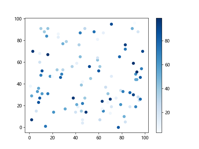 # 这三行代码使编译器能够绘图: import sys import matplotlib matplotlib.use('Agg') import matplotlib.pyplot as plt import numpy as np x = np.random.randint(100, size=(100)) y = np.random.randint(100, size=(100)) colors = np.random.randint(100, size=(100)) # 使用蓝色渐变绘制散点图: plt.scatter(x, y, c=colors, cmap='Blues') plt.colorbar() # 显示颜色条 plt.show() # 显示图形 # 这两行代码使编译器能够输出图形: plt.savefig(sys.stdout.buffer) sys.stdout.flush()