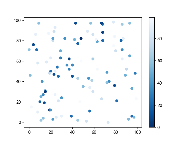 # 这三行代码使编译器能够绘图: import sys import matplotlib matplotlib.use('Agg') import matplotlib.pyplot as plt import numpy as np x = np.random.randint(100, size=(100)) y = np.random.randint(100, size=(100)) colors = np.random.randint(100, size=(100)) # 使用反向蓝色渐变绘制散点图: plt.scatter(x, y, c=colors, cmap='Blues_r') plt.colorbar() # 显示颜色条 plt.show() # 显示图形 # 这两行代码使编译器能够输出图形: plt.savefig(sys.stdout.buffer) sys.stdout.flush()
