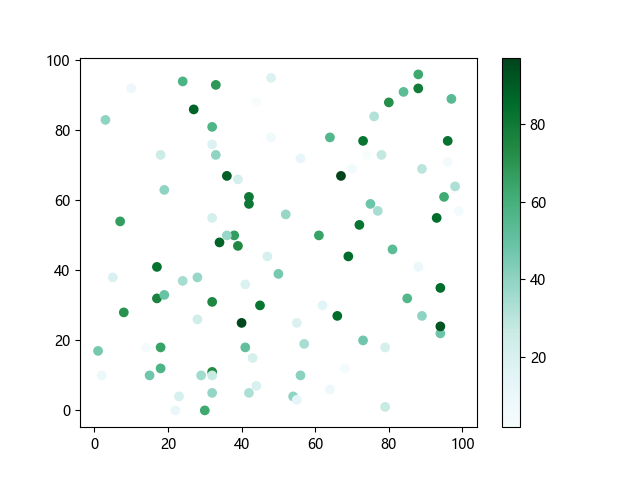 # 这三行代码使编译器能够绘图: import sys import matplotlib matplotlib.use('Agg') import matplotlib.pyplot as plt import numpy as np x = np.random.randint(100, size=(100)) y = np.random.randint(100, size=(100)) colors = np.random.randint(100, size=(100)) # 使用蓝绿色渐变绘制散点图: plt.scatter(x, y, c=colors, cmap='BuGn') plt.colorbar() # 显示颜色条 plt.show() # 显示图形 # 这两行代码使编译器能够输出图形: plt.savefig(sys.stdout.buffer) sys.stdout.flush()