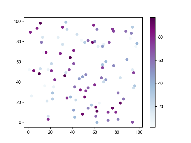 # 这三行代码使编译器能够绘图: import sys import matplotlib matplotlib.use('Agg') import matplotlib.pyplot as plt import numpy as np x = np.random.randint(100, size=(100)) y = np.random.randint(100, size=(100)) colors = np.random.randint(100, size=(100)) # 使用蓝紫色渐变绘制散点图: plt.scatter(x, y, c=colors, cmap='BuPu') plt.colorbar() # 显示颜色条 plt.show() # 显示图形 # 这两行代码使编译器能够输出图形: plt.savefig(sys.stdout.buffer) sys.stdout.flush()