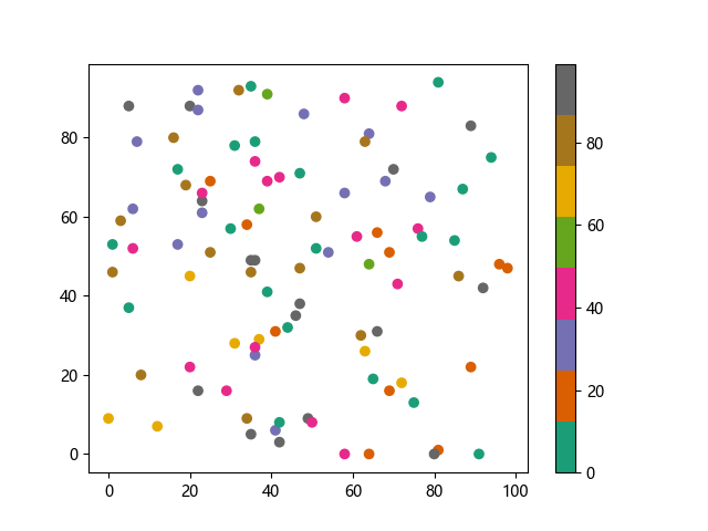 # 这三行代码使编译器能够绘图: import sys import matplotlib matplotlib.use('Agg') import matplotlib.pyplot as plt import numpy as np x = np.random.randint(100, size=(100)) y = np.random.randint(100, size=(100)) colors = np.random.randint(100, size=(100)) # 使用 Dark2 配色方案绘制散点图: plt.scatter(x, y, c=colors, cmap='Dark2') plt.colorbar() plt.show() # 这两行代码使编译器能够输出图形: plt.savefig(sys.stdout.buffer) sys.stdout.flush()