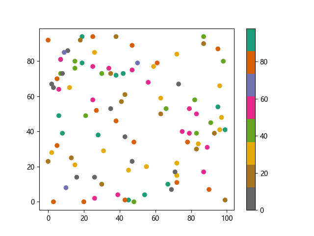 # 这三行代码使编译器能够绘图: import sys import matplotlib matplotlib.use('Agg') import matplotlib.pyplot as plt import numpy as np x = np.random.randint(100, size=(100)) y = np.random.randint(100, size=(100)) colors = np.random.randint(100, size=(100)) # 使用反向 Dark2 配色方案绘制散点图: plt.scatter(x, y, c=colors, cmap='Dark2_r') plt.colorbar() plt.show() # 这两行代码使编译器能够输出图形: plt.savefig(sys.stdout.buffer) sys.stdout.flush()