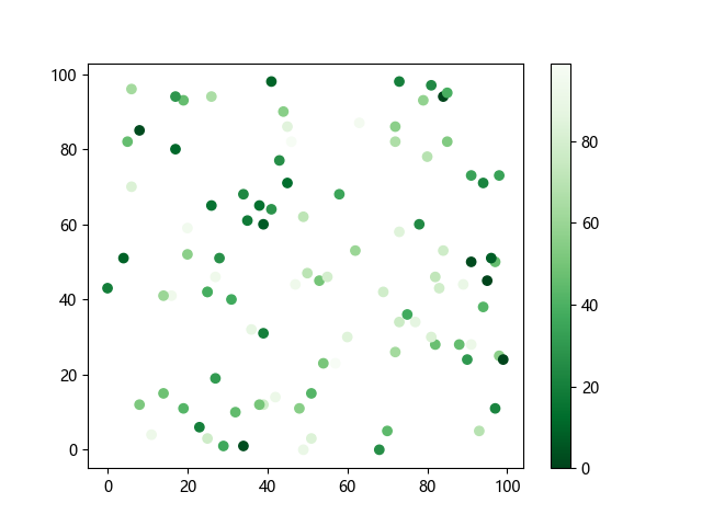 # 这三行代码使编译器能够绘图: import sys import matplotlib matplotlib.use('Agg') import matplotlib.pyplot as plt import numpy as np x = np.random.randint(100, size=(100)) y = np.random.randint(100, size=(100)) colors = np.random.randint(100, size=(100)) # 使用反向绿色渐变绘制散点图: plt.scatter(x, y, c=colors, cmap='Greens_r') plt.colorbar() plt.show() # 这两行代码使编译器能够输出图形: plt.savefig(sys.stdout.buffer) sys.stdout.flush()