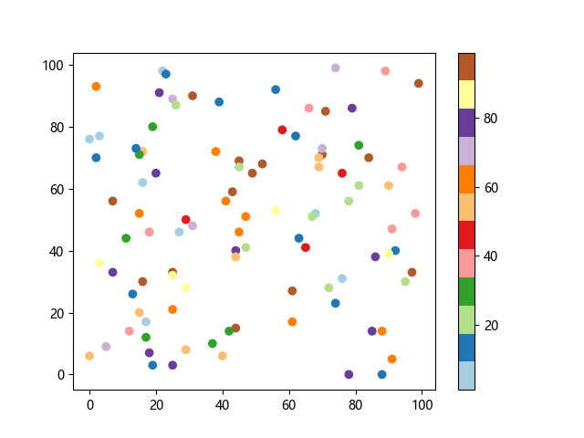 # 这三行代码使编译器能够绘图: import sys import matplotlib matplotlib.use('Agg') import matplotlib.pyplot as plt import numpy as np x = np.random.randint(100, size=(100)) y = np.random.randint(100, size=(100)) colors = np.random.randint(100, size=(100)) # 使用配对色系绘制散点图: plt.scatter(x, y, c=colors, cmap='Paired') plt.colorbar() plt.show() # 这两行代码使编译器能够输出图形: plt.savefig(sys.stdout.buffer) sys.stdout.flush()