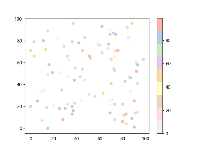 # 这三行代码使编译器能够绘图: import sys import matplotlib matplotlib.use('Agg') import matplotlib.pyplot as plt import numpy as np x = np.random.randint(100, size=(100)) y = np.random.randint(100, size=(100)) colors = np.random.randint(100, size=(100)) # 绘制反向 Pastel1 配色方案的散点图: plt.scatter(x, y, c=colors, cmap='Pastel1_r') plt.colorbar() plt.show() # 这两行代码使编译器能够输出图形: plt.savefig(sys.stdout.buffer) sys.stdout.flush()