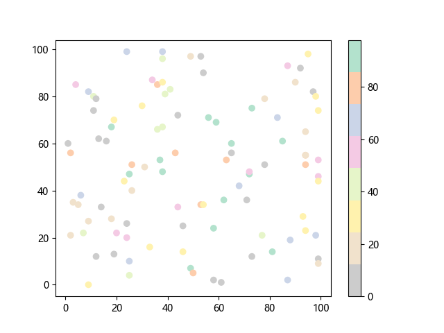 # 这三行代码使编译器能够绘图: import sys import matplotlib matplotlib.use('Agg') import matplotlib.pyplot as plt import numpy as np # 生成 100 个随机 x 坐标: x = np.random.randint(100, size=(100)) # 生成 100 个随机 y 坐标: y = np.random.randint(100, size=(100)) # 生成 100 个随机颜色值: colors = np.random.randint(100, size=(100)) # 绘制彩色散点图 plt.scatter(x, y, c=colors, cmap='Pastel2_r') plt.colorbar() # 显示颜色条 plt.show() # 显示图形 # 这两行代码使编译器能够输出图形: plt.savefig(sys.stdout.buffer) sys.stdout.flush()