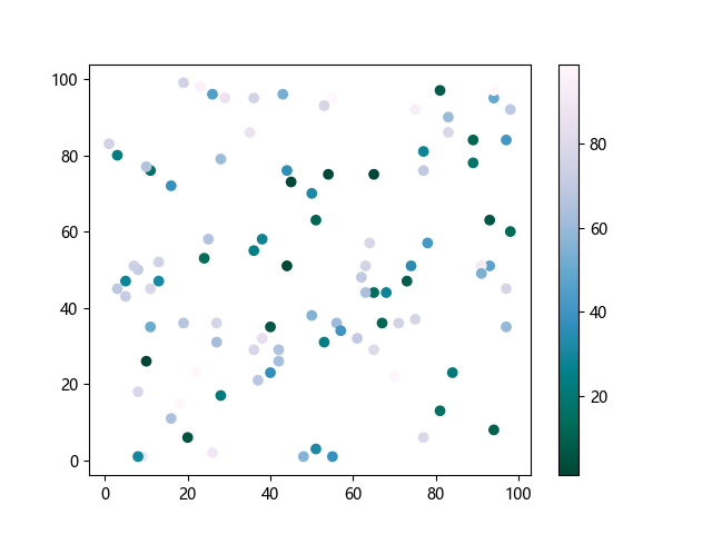 # 这三行代码使编译器能够绘图: import sys import matplotlib matplotlib.use('Agg') import matplotlib.pyplot as plt import numpy as np # 生成随机数据: x = np.random.randint(100, size=(100)) y = np.random.randint(100, size=(100)) colors = np.random.randint(100, size=(100)) # 使用 PuBuGn_r 配色方案绘制紫蓝绿反向渐变色散点图: plt.scatter(x, y, c=colors, cmap='PuBuGn_r') plt.colorbar() # 显示颜色条 plt.show() # 显示图形 # 这两行代码使编译器能够输出图形: plt.savefig(sys.stdout.buffer) sys.stdout.flush()
