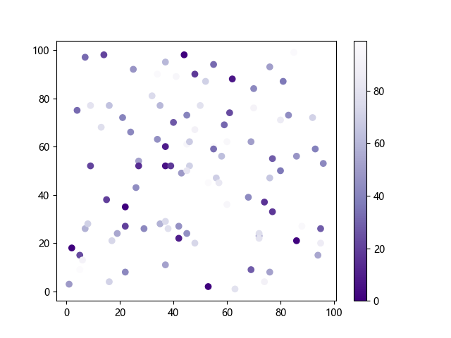 # 这三行代码使编译器能够绘图: import sys import matplotlib matplotlib.use('Agg') import matplotlib.pyplot as plt import numpy as np # 生成随机数据: x = np.random.randint(100, size=(100)) y = np.random.randint(100, size=(100)) colors = np.random.randint(100, size=(100)) # 使用 Purples_r 配色方案绘制紫色反向渐变色散点图: plt.scatter(x, y, c=colors, cmap='Purples_r') plt.colorbar() # 显示颜色条 plt.show() # 显示图形 # 这两行代码使编译器能够输出图形: plt.savefig(sys.stdout.buffer) sys.stdout.flush()