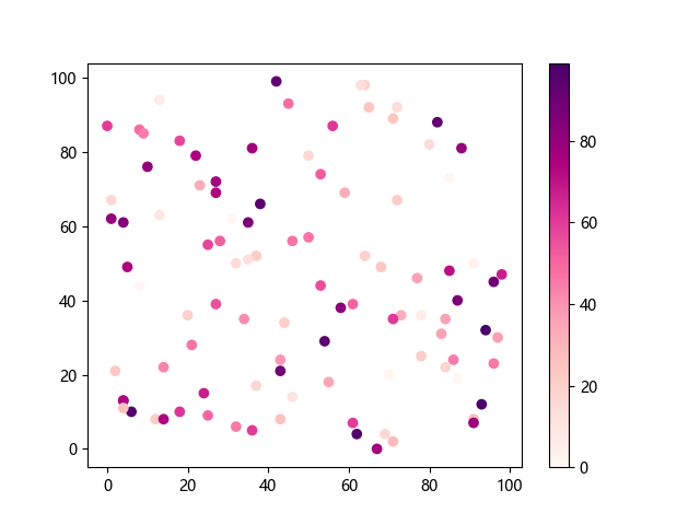 # 这三行代码使编译器能够绘图: import sys import matplotlib matplotlib.use('Agg') import matplotlib.pyplot as plt import numpy as np # 生成随机数据 x = np.random.randint(100, size=(100)) y = np.random.randint(100, size=(100)) colors = np.random.randint(100, size=(100)) # 使用 RdPu 配色方案绘制红紫色渐变色散点图: plt.scatter(x, y, c=colors, cmap='RdPu') plt.colorbar() # 显示颜色条 plt.show() # 显示图形 # 这两行代码使编译器能够输出图形: plt.savefig(sys.stdout.buffer) sys.stdout.flush()