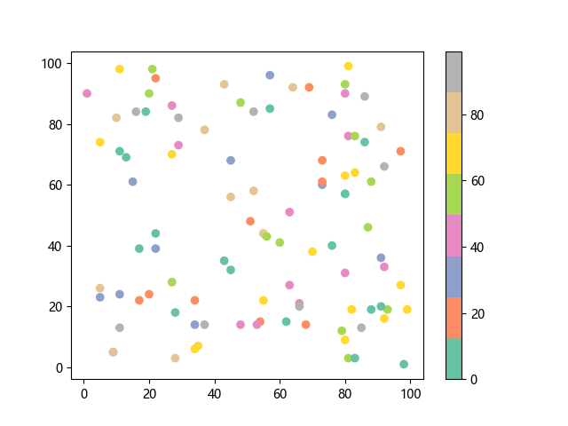 # 这三行代码使编译器能够绘图: import sys import matplotlib matplotlib.use('Agg') import matplotlib.pyplot as plt import numpy as np # 生成随机数据: x = np.random.randint(100, size=(100)) y = np.random.randint(100, size=(100)) colors = np.random.randint(100, size=(100)) # 使用 Set2 (8 色调色板)配色方案绘制 Set2 离散色散点图: plt.scatter(x, y, c=colors, cmap='Set2') plt.colorbar() # 显示颜色条 plt.show() # 显示图形 # 这两行代码使编译器能够输出图形: plt.savefig(sys.stdout.buffer) sys.stdout.flush()
