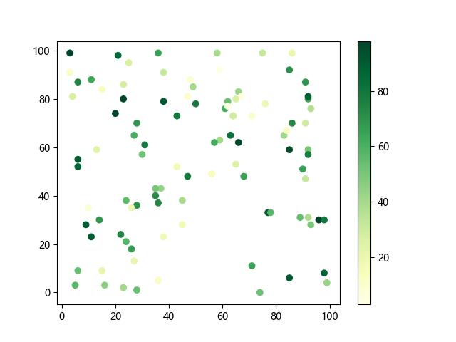 # 这三行代码使编译器能够绘图: import sys import matplotlib matplotlib.use('Agg') import matplotlib.pyplot as plt import numpy as np # 生成随机数据: x = np.random.randint(100, size=(100)) y = np.random.randint(100, size=(100)) colors = np.random.randint(100, size=(100)) # 使用 YlGn (黄-绿渐变)配色方案绘制散点图: plt.scatter(x, y, c=colors, cmap='YlGn') plt.colorbar() # 显示颜色条 plt.show() # 显示图形 # 这两行代码使编译器能够输出图形: plt.savefig(sys.stdout.buffer) sys.stdout.flush()