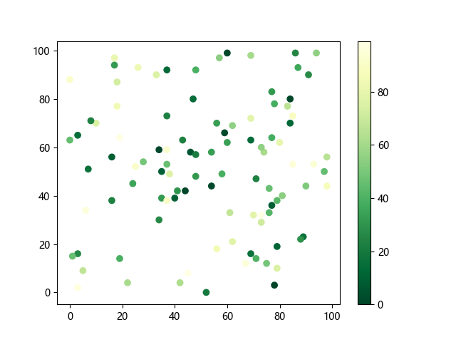 # 这三行代码使编译器能够绘图: import sys import matplotlib matplotlib.use('Agg') import matplotlib.pyplot as plt import numpy as np # 生成随机数据: x = np.random.randint(100, size=(100)) y = np.random.randint(100, size=(100)) colors = np.random.randint(100, size=(100)) # 使用YlGn_r(黄-绿反向渐变)配色方案绘制散点图: plt.scatter(x, y, c=colors, cmap='YlGn_r') plt.colorbar() # 显示颜色条 plt.show() # 显示图形 # 这两行代码使编译器能够输出图形: plt.savefig(sys.stdout.buffer) sys.stdout.flush()
