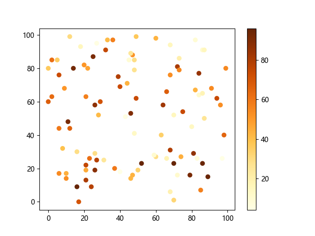 # 这三行代码使编译器能够绘图: import sys import matplotlib matplotlib.use('Agg') import matplotlib.pyplot as plt import numpy as np # 生成随机数据: x = np.random.randint(100, size=(100)) y = np.random.randint(100, size=(100)) colors = np.random.randint(100, size=(100)) # 使用 YlOrBr (黄-橙-棕渐变)配色方案绘制黄橙棕渐变散点图: plt.scatter(x, y, c=colors, cmap='YlOrBr') plt.colorbar() # 显示颜色条 plt.show() # 显示图形 # 这两行代码使编译器能够输出图形: plt.savefig(sys.stdout.buffer) sys.stdout.flush()