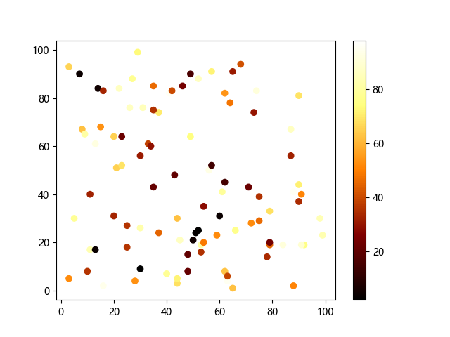 # 这三行代码使编译器能够绘图: import sys import matplotlib matplotlib.use('Agg') import matplotlib.pyplot as plt import numpy as np # 生成随机数据: x = np.random.randint(100, size=(100)) y = np.random.randint(100, size=(100)) colors = np.random.randint(100, size=(100)) # 使用 afmhot (热金属)配色方案绘制热金属色散点图: plt.scatter(x, y, c=colors, cmap='afmhot') plt.colorbar() # 显示颜色条 plt.show() # 显示图形 # 这两行代码使编译器能够输出图形: plt.savefig(sys.stdout.buffer) sys.stdout.flush()