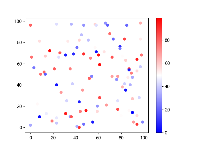 # 这三行代码使编译器能够绘图: import sys import matplotlib matplotlib.use('Agg') import matplotlib.pyplot as plt import numpy as np # 生成随机数据 x = np.random.randint(100, size=(100)) y = np.random.randint(100, size=(100)) colors = np.random.randint(100, size=(100)) # 使用 bwr 配色方案绘制蓝白红渐变色散点图: plt.scatter(x, y, c=colors, cmap='bwr') plt.colorbar() plt.show() # 这两行代码使编译器能够输出图形: plt.savefig(sys.stdout.buffer) sys.stdout.flush()