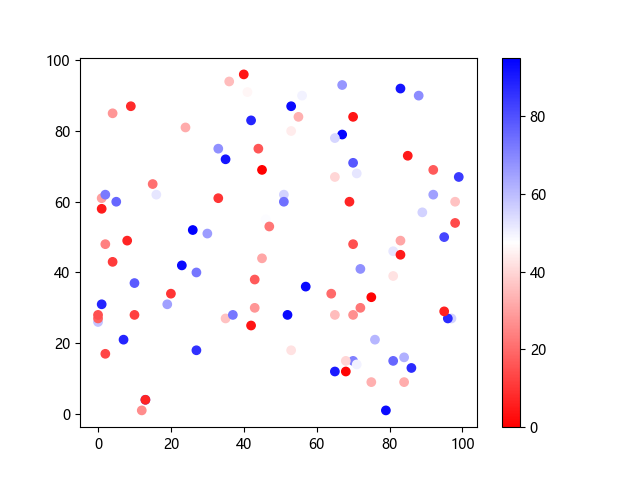 # 这三行代码使编译器能够绘图: import sys import matplotlib matplotlib.use('Agg') import matplotlib.pyplot as plt import numpy as np # 生成随机数据点 x = np.random.randint(100, size=(100)) y = np.random.randint(100, size=(100)) colors = np.random.randint(100, size=(100)) # 使用 bwr_r 配色方案绘制蓝白红反向渐变色散点图: plt.scatter(x, y, c=colors, cmap='bwr_r') plt.colorbar() plt.show() # 这两行代码使编译器能够输出图形: plt.savefig(sys.stdout.buffer) sys.stdout.flush()