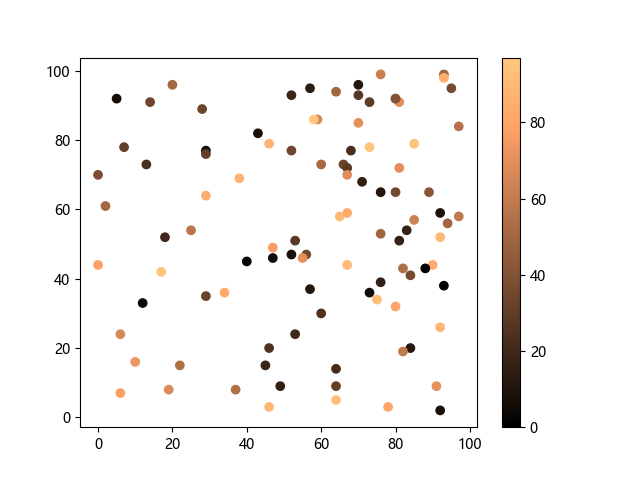 # 这三行代码使编译器能够绘图: import sys import matplotlib matplotlib.use('Agg') import matplotlib.pyplot as plt import numpy as np # 生成随机数据 x = np.random.randint(100, size=(100)) y = np.random.randint(100, size=(100)) colors = np.random.randint(100, size=(100)) # 使用 copper 配色方案绘制铜色渐变色散点图: plt.scatter(x, y, c=colors, cmap='copper') plt.colorbar() plt.show() # 这两行代码使编译器能够输出图形: plt.savefig(sys.stdout.buffer) sys.stdout.flush()
