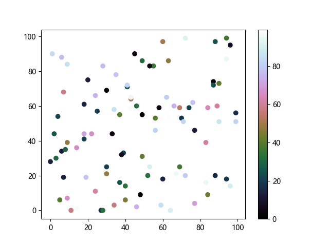 # 这三行代码使编译器能够绘图: import sys import matplotlib matplotlib.use('Agg') import matplotlib.pyplot as plt import numpy as np # 生成随机数据 x = np.random.randint(100, size=(100)) y = np.random.randint(100, size=(100)) colors = np.random.randint(100, size=(100)) # 使用 cubehelix 配色方案绘制螺旋立方体渐变色散点图: plt.scatter(x, y, c=colors, cmap='cubehelix') plt.colorbar() plt.show() # 这两行代码使编译器能够输出图形: plt.savefig(sys.stdout.buffer) sys.stdout.flush()