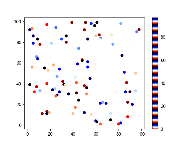 # 这三行代码使编译器能够绘图: import sys import matplotlib matplotlib.use('Agg') import matplotlib.pyplot as plt import numpy as np # 生成随机数据 x = np.random.randint(100, size=(100)) y = np.random.randint(100, size=(100)) colors = np.random.randint(100, size=(100)) # 使用 flag 配色方案绘制旗帜渐变色散点图: plt.scatter(x, y, c=colors, cmap='flag') plt.colorbar() plt.show() # 这两行代码使编译器能够输出图形: plt.savefig(sys.stdout.buffer) sys.stdout.flush()