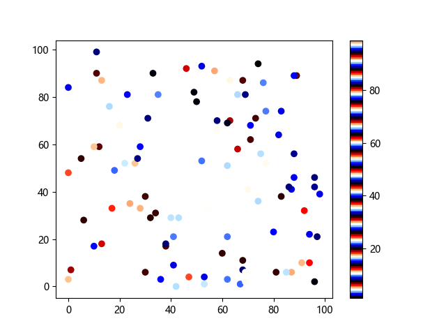 # 这三行代码使编译器能够绘图: import sys import matplotlib matplotlib.use('Agg') import matplotlib.pyplot as plt import numpy as np # 生成随机数据点 x = np.random.randint(100, size=(100)) y = np.random.randint(100, size=(100)) colors = np.random.randint(100, size=(100)) # 使用 flag_r 配色方案绘制旗帜反向渐变色散点图: plt.scatter(x, y, c=colors, cmap='flag_r') plt.colorbar() plt.show() # 这两行代码使编译器能够输出图形: plt.savefig(sys.stdout.buffer) sys.stdout.flush()