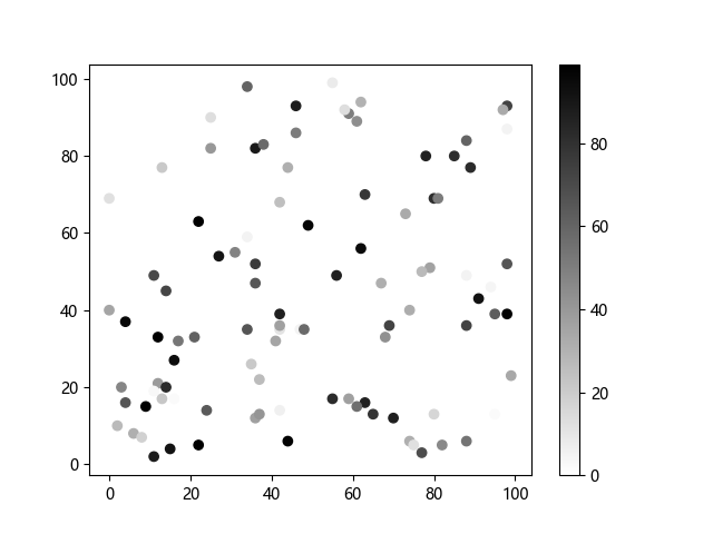 # 这三行代码使编译器能够绘图: import sys import matplotlib matplotlib.use('Agg') import matplotlib.pyplot as plt import numpy as np # 生成随机数据点 x = np.random.randint(100, size=(100)) y = np.random.randint(100, size=(100)) colors = np.random.randint(100, size=(100)) # 使用 gist_gray_r 配色方案绘制灰度反向渐变色散点图: plt.scatter(x, y, c=colors, cmap='gist_gray_r') plt.colorbar() plt.show() # 这两行代码使编译器能够输出图形: plt.savefig(sys.stdout.buffer) sys.stdout.flush()