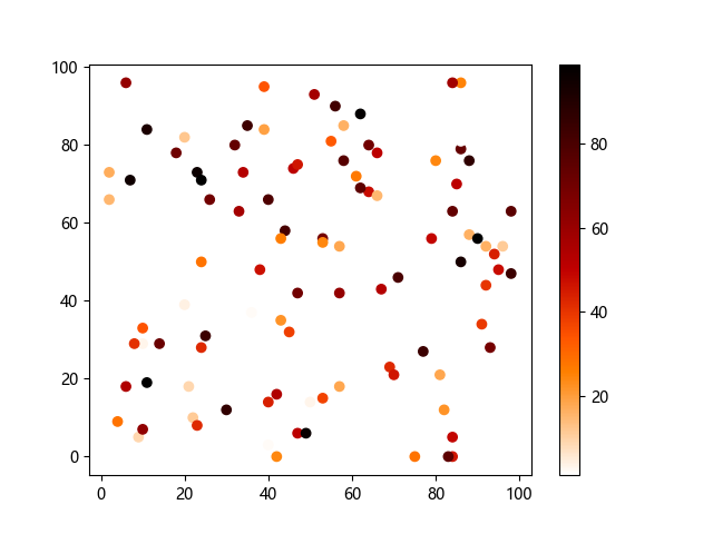 # 这三行代码使编译器能够绘图: import sys import matplotlib matplotlib.use('Agg') import matplotlib.pyplot as plt import numpy as np # 生成随机数据点 x = np.random.randint(100, size=(100)) y = np.random.randint(100, size=(100)) colors = np.random.randint(100, size=(100)) # 使用 gist_heat_r 配色方案绘制热力图反向渐变色散点图: plt.scatter(x, y, c=colors, cmap='gist_heat_r') plt.colorbar() plt.show() # 这两行代码使编译器能够输出图形: plt.savefig(sys.stdout.buffer) sys.stdout.flush()
