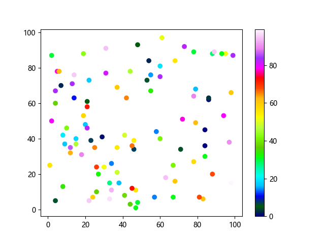# 这三行代码使编译器能够绘图: import sys import matplotlib matplotlib.use('Agg') import matplotlib.pyplot as plt import numpy as np # 生成随机数据 x = np.random.randint(100, size=(100)) y = np.random.randint(100, size=(100)) colors = np.random.randint(100, size=(100)) # 使用 gist_ncar 配色方案绘制NCAR渐变色散点图: plt.scatter(x, y, c=colors, cmap='gist_ncar') plt.colorbar() plt.show() # 这两行代码使编译器能够输出图形: plt.savefig(sys.stdout.buffer) sys.stdout.flush()
