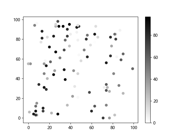 # 这三行代码使编译器能够绘图: import sys import matplotlib matplotlib.use('Agg') import matplotlib.pyplot as plt import numpy as np # 生成随机数据 x = np.random.randint(100, size=(100)) y = np.random.randint(100, size=(100)) colors = np.random.randint(100, size=(100)) # 使用 gist_yarg 配色方案绘制灰度渐变色散点图: plt.scatter(x, y, c=colors, cmap='gist_yarg') plt.colorbar() plt.show() # 这两行代码使编译器能够输出图形: plt.savefig(sys.stdout.buffer) sys.stdout.flush()