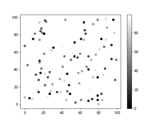 # 这三行代码使编译器能够绘图: import sys import matplotlib matplotlib.use('Agg') import matplotlib.pyplot as plt import numpy as np # 生成随机数据点 x = np.random.randint(100, size=(100)) y = np.random.randint(100, size=(100)) colors = np.random.randint(100, size=(100)) # 使用 gist_yarg_r 配色方案绘制灰度反向渐变色散点图: plt.scatter(x, y, c=colors, cmap='gist_yarg_r') plt.colorbar() plt.show() # 这两行代码使编译器能够输出图形: plt.savefig(sys.stdout.buffer) sys.stdout.flush()