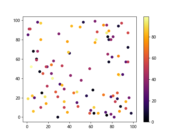 # 这三行代码使编译器能够绘图: import sys import matplotlib matplotlib.use('Agg') import matplotlib.pyplot as plt import numpy as np # 生成随机数据 x = np.random.randint(100, size=(100)) y = np.random.randint(100, size=(100)) colors = np.random.randint(100, size=(100)) # 使用 inferno 配色方案绘制地狱火渐变色散点图: plt.scatter(x, y, c=colors, cmap='inferno') plt.colorbar() plt.show() # 这两行代码使编译器能够输出图形: plt.savefig(sys.stdout.buffer) sys.stdout.flush()