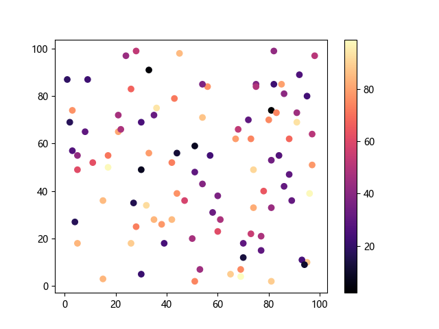 # 这三行代码使编译器能够绘图: import sys import matplotlib matplotlib.use('Agg') import matplotlib.pyplot as plt import numpy as np # 生成随机数据 x = np.random.randint(100, size=(100)) y = np.random.randint(100, size=(100)) colors = np.random.randint(100, size=(100)) # 使用 magma 配色方案绘制岩浆渐变色散点图: plt.scatter(x, y, c=colors, cmap='magma') plt.colorbar() plt.show() # 这两行代码使编译器能够输出图形: plt.savefig(sys.stdout.buffer) sys.stdout.flush()
