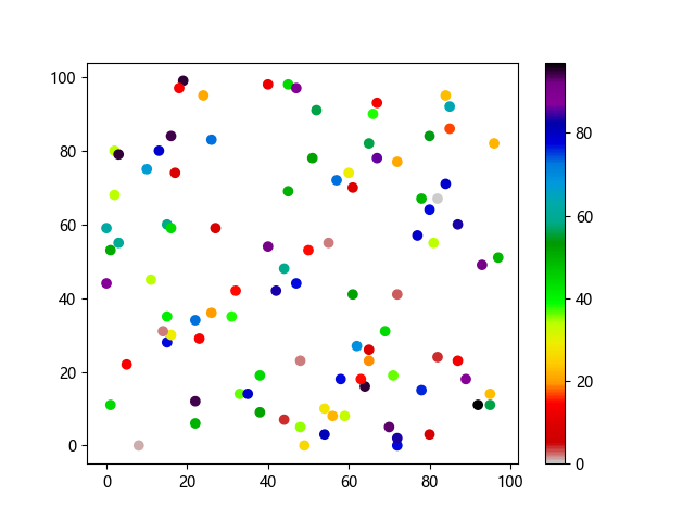 #Three lines to make our compiler able to draw: import sys import matplotlib matplotlib.use('Agg') import matplotlib.pyplot as plt import numpy as np x = np.random.randint(100, size=(100)) y = np.random.randint(100, size=(100)) colors = np.random.randint(100, size=(100)) plt.scatter(x, y, c=colors, cmap='nipy_spectral_r') plt.colorbar() plt.show() #Two lines to make our compiler able to draw: plt.savefig(sys.stdout.buffer) sys.stdout.flush()