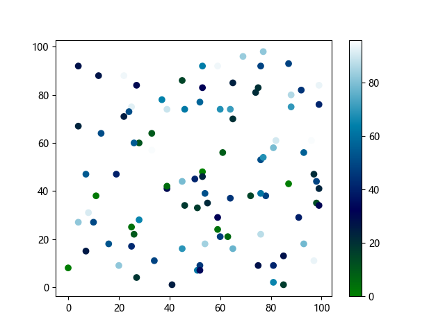 # 这三行代码使编译器能够绘图: import sys import matplotlib matplotlib.use('Agg') import matplotlib.pyplot as plt import numpy as np # 生成随机数据 x = np.random.randint(100, size=(100)) y = np.random.randint(100, size=(100)) colors = np.random.randint(100, size=(100)) # 使用 ocean 配色方案绘制海洋渐变色散点图: plt.scatter(x, y, c=colors, cmap='ocean') plt.colorbar() plt.show() # 这两行代码使编译器能够输出图形: plt.savefig(sys.stdout.buffer) sys.stdout.flush()