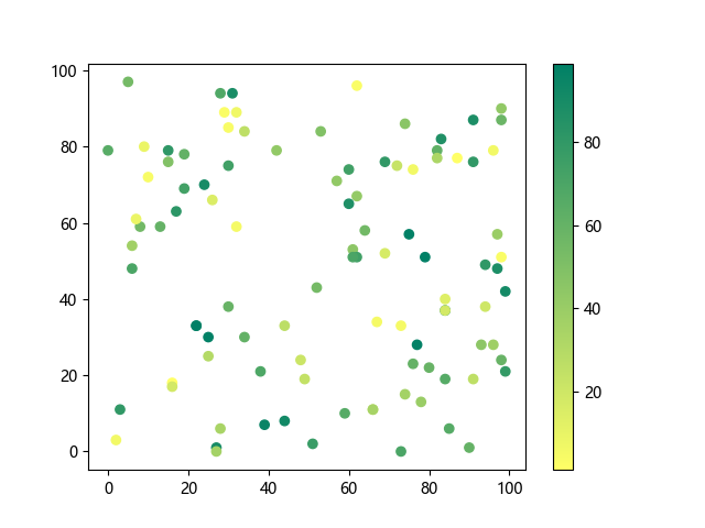 # 以下三行代码使编译器支持绘图功能: import sys import matplotlib matplotlib.use('Agg') import matplotlib.pyplot as plt import numpy as np # 生成随机数据: x = np.random.randint(100, size=(100)) y = np.random.randint(100, size=(100)) colors = np.random.randint(100, size=(100)) # 使用 summer 反向配色方案创建散点图: plt.scatter(x, y, c=colors, cmap='summer_r') plt.colorbar() plt.show() # 以下两行代码使编译器能够输出图形: plt.savefig(sys.stdout.buffer) sys.stdout.flush()