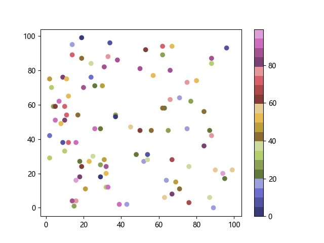 # 以下三行代码使编译器支持绘图功能: import sys import matplotlib matplotlib.use('Agg') import matplotlib.pyplot as plt import numpy as np # 生成随机数据: x = np.random.randint(100, size=(100)) y = np.random.randint(100, size=(100)) colors = np.random.randint(100, size=(100)) # 使用 tab20b 离散配色方案创建散点图: plt.scatter(x, y, c=colors, cmap='tab20b') plt.colorbar() plt.show() # 以下两行代码使编译器能够输出图形: plt.savefig(sys.stdout.buffer) sys.stdout.flush()