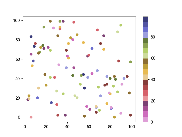 # 以下三行代码使编译器支持绘图功能: import sys import matplotlib matplotlib.use('Agg') import matplotlib.pyplot as plt import numpy as np # 生成随机数据: x = np.random.randint(100, size=(100)) y = np.random.randint(100, size=(100)) colors = np.random.randint(100, size=(100)) # 使用 tab20b 反向离散配色方案创建散点图: plt.scatter(x, y, c=colors, cmap='tab20b_r') plt.colorbar() plt.show() # 以下两行代码使编译器能够输出图形: plt.savefig(sys.stdout.buffer) sys.stdout.flush()