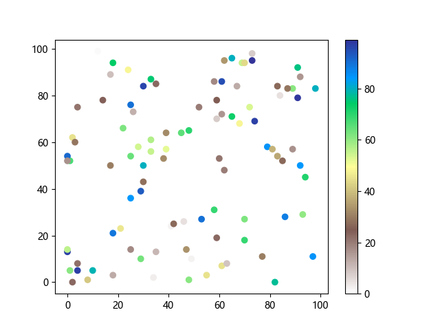 # 以下三行代码使编译器支持绘图功能: import sys import matplotlib matplotlib.use('Agg') import matplotlib.pyplot as plt import numpy as np # 生成随机数据: x = np.random.randint(100, size=(100)) y = np.random.randint(100, size=(100)) colors = np.random.randint(100, size=(100)) # 使用地形反向 (terrain_r) 配色方案创建散点图: plt.scatter(x, y, c=colors, cmap='terrain_r') plt.colorbar() plt.show() # 以下两行代码使编译器能够输出图形: plt.savefig(sys.stdout.buffer) sys.stdout.flush()