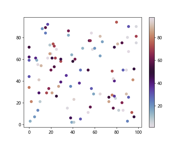 # 以下三行代码使编译器支持绘图功能: import sys import matplotlib matplotlib.use('Agg') import matplotlib.pyplot as plt import numpy as np # 生成随机数据: x = np.random.randint(100, size=(100)) y = np.random.randint(100, size=(100)) colors = np.random.randint(100, size=(100)) # 使用 twilight 配色方案创建散点图: plt.scatter(x, y, c=colors, cmap='twilight') plt.colorbar() plt.show() # 以下两行代码使编译器能够输出图形: plt.savefig(sys.stdout.buffer) sys.stdout.flush()