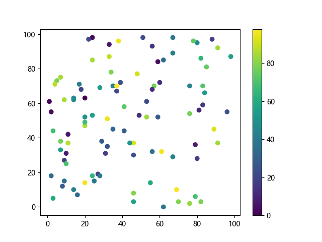 # 以下三行代码使编译器支持绘图功能: import sys import matplotlib matplotlib.use('Agg') import matplotlib.pyplot as plt import numpy as np # 生成随机数据: x = np.random.randint(100, size=(100)) y = np.random.randint(100, size=(100)) colors = np.random.randint(100, size=(100)) # 使用 viridis 配色方案创建散点图: plt.scatter(x, y, c=colors, cmap='viridis') plt.colorbar() plt.show() # 以下两行代码使编译器能够输出图形: plt.savefig(sys.stdout.buffer) sys.stdout.flush()