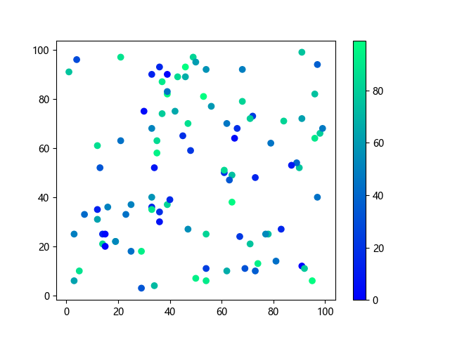 # 以下三行代码使编译器支持绘图功能: import sys import matplotlib matplotlib.use('Agg') import matplotlib.pyplot as plt import numpy as np # 生成随机数据: x = np.random.randint(100, size=(100)) y = np.random.randint(100, size=(100)) colors = np.random.randint(100, size=(100)) # 使用冬季 (winter) 配色方案创建散点图: plt.scatter(x, y, c=colors, cmap='winter') plt.colorbar() plt.show() # 以下两行代码使编译器能够输出图形: plt.savefig(sys.stdout.buffer) sys.stdout.flush()