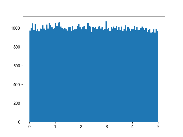 # 使编译器支持绘图的三行配置: import sys import matplotlib matplotlib.use('Agg') import numpy import matplotlib.pyplot as plt x = numpy.random.uniform(0.0, 5.0, 100000) plt.hist(x, 100) plt.show() # 实现编译器绘图功能的两行代码: plt.savefig(sys.stdout.buffer) sys.stdout.flush()