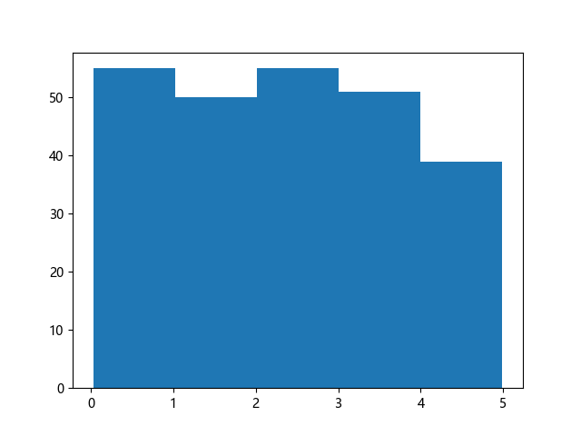 # 使我们的编译器能够绘制的三行代码: import sys import matplotlib matplotlib.use('Agg') import numpy import matplotlib.pyplot as plt x = numpy.random.uniform(0.0, 5.0, 250) plt.hist(x, 5) plt.show() # 使我们的编译器能够绘制的两行代码: plt.savefig(sys.stdout.buffer) sys.stdout.flush()