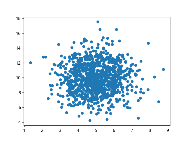 # 三行配置使编译器支持绘图功能: import sys import matplotlib matplotlib.use('Agg') import numpy import matplotlib.pyplot as plt # 生成正态分布数据:x~N(5.0,1.0),y~N(10.0,2.0),各 1000 个样本点: x = numpy.random.normal(5.0, 1.0, 1000) y = numpy.random.normal(10.0, 2.0, 1000) # 绘制散点图 plt.scatter(x, y) plt.show() # 两行代码实现图形输出: plt.savefig(sys.stdout.buffer) sys.stdout.flush()